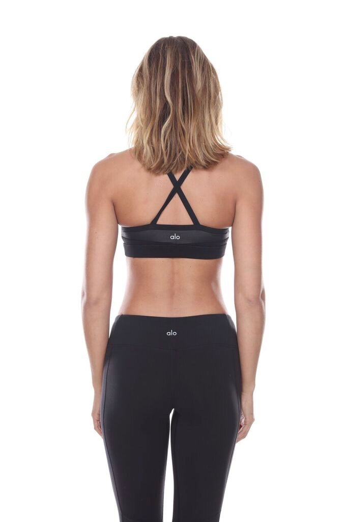 The Becka Bra by Alo features delicate crisscross straps and glossy fabric contrast details. Medium support with removable pads for an extra bit of optional coverage. Stay feminine without giving up support.