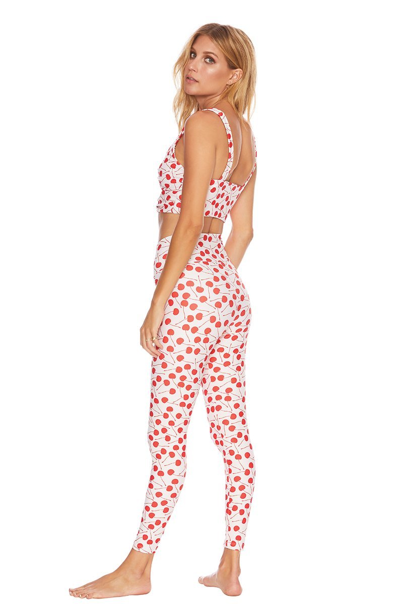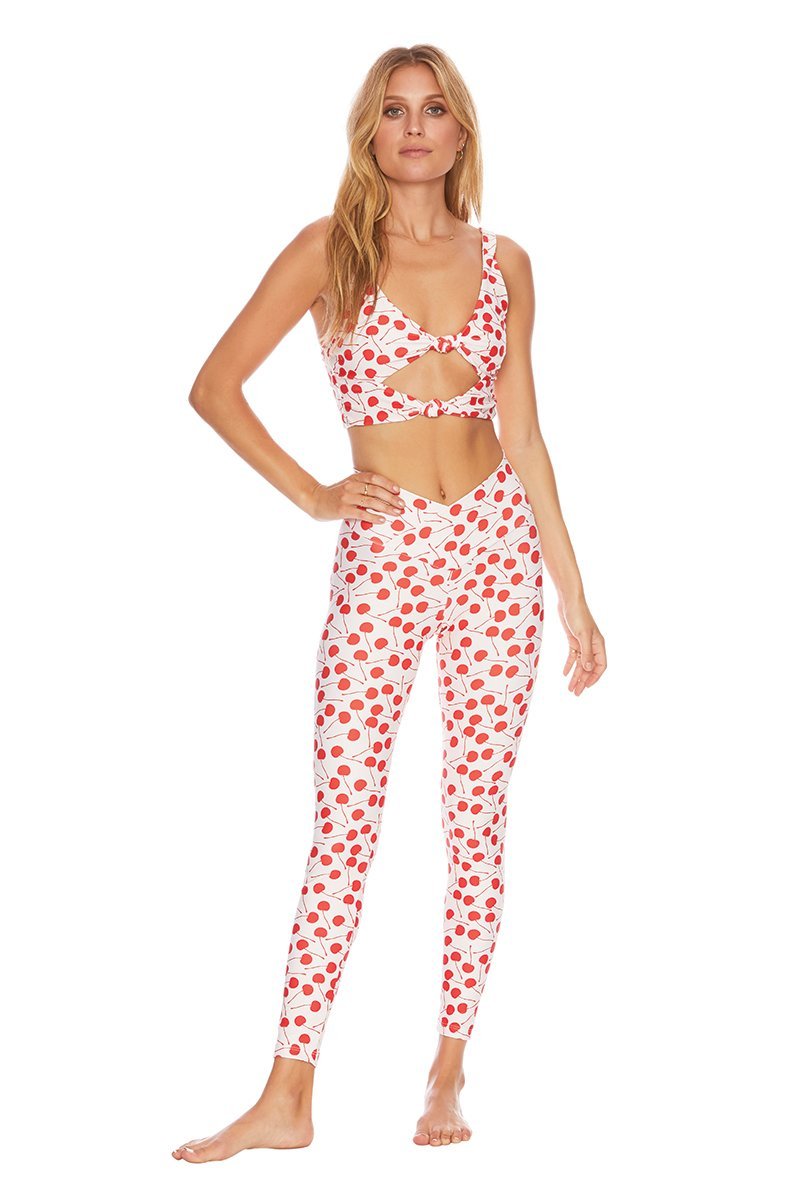 The cherry print Bowie Top by Sport Riot for Beach Riot is a double knot sport top or long bra. Featuring an adorable red and white retro cherry print. Pair with the coordinating Dotty Legging for an irresistably darling look.