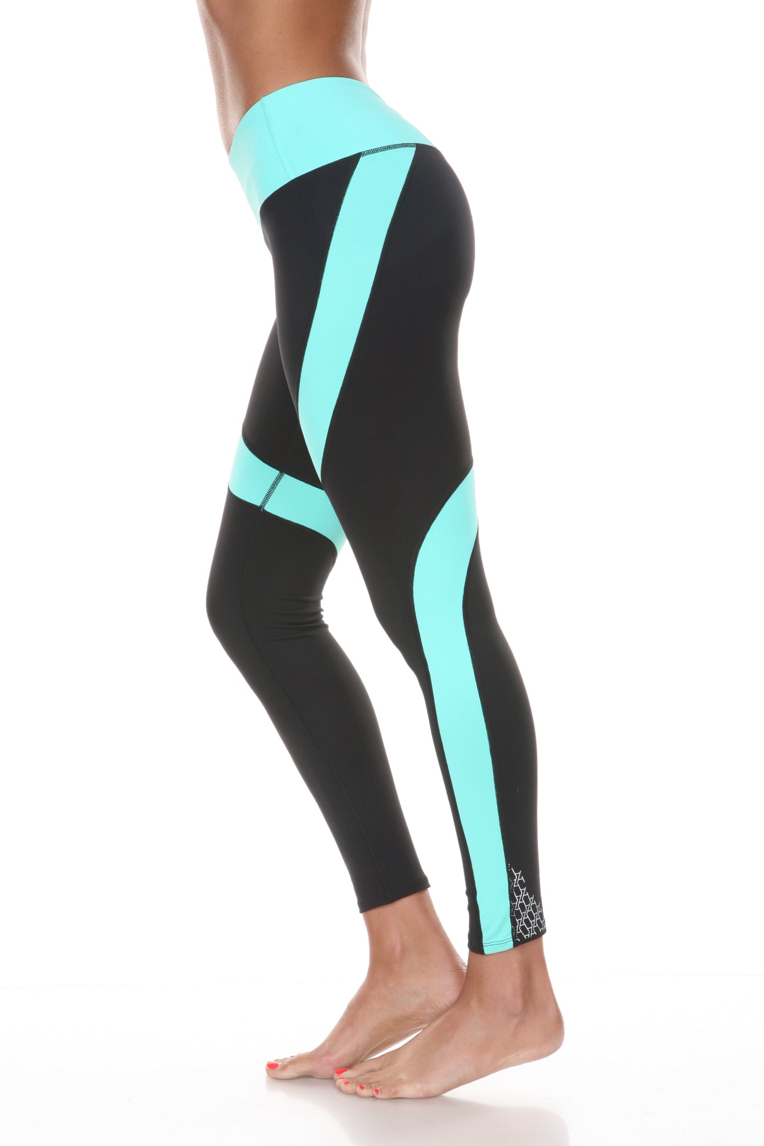 These super-stretchy leggings by Body Glove are constructed with flatlock seams for chafe-free movement and are made with moisture-wicking breathable fabric. Lagoon detail adds a punch of color. Wide 4” reinforced waistband keeps everything smooth while providing a hidden pocket in the back for your necessities. Soft silky touch for ultimate comfort.
