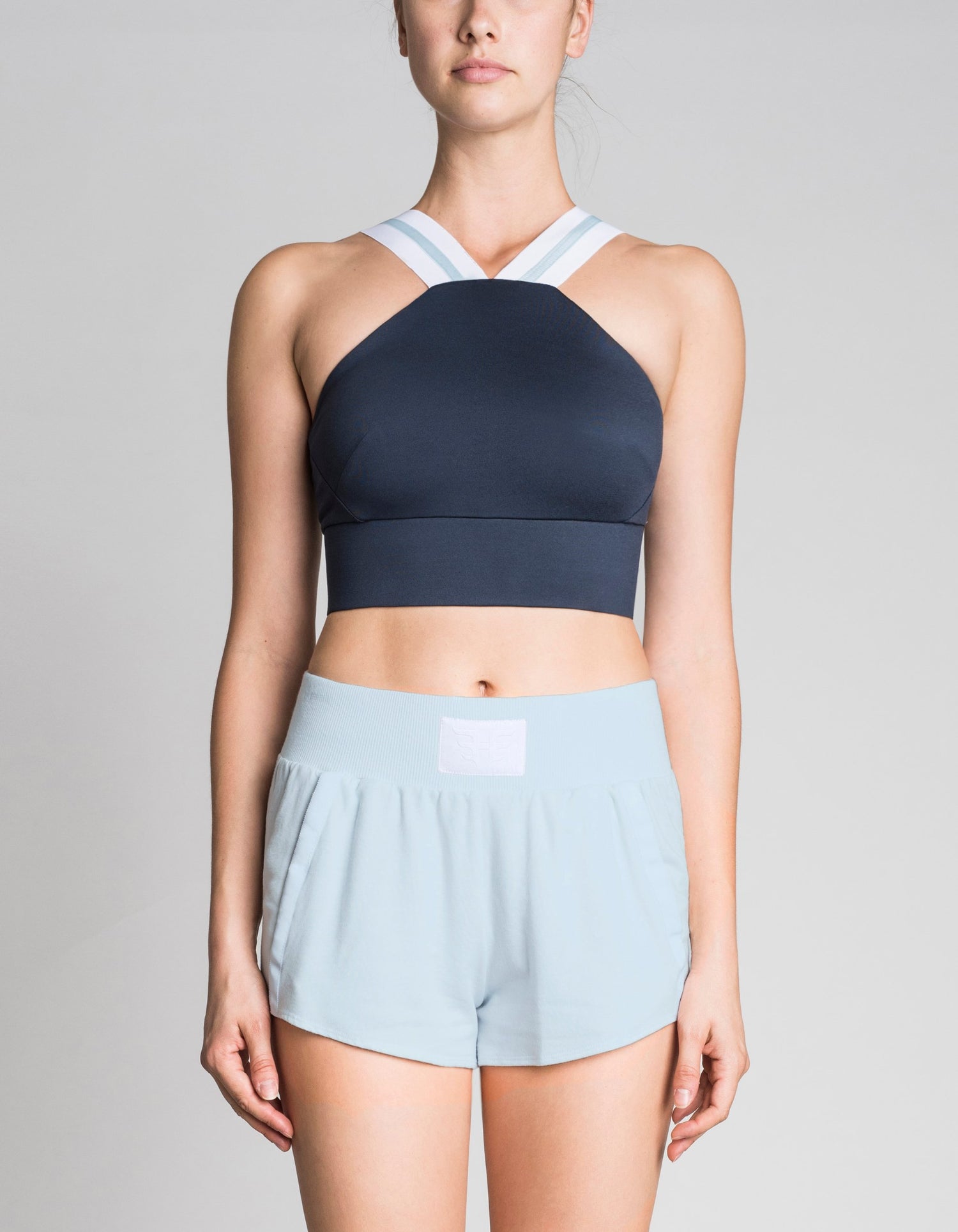 No restraint was taken in designing the lovely Halter Bra Top by Heroine Sport. Blending style, coverage, and support for a perfect complement with high waisted pants. Fully lined with a wide 3" elasticated band for medium to high support. Baby blue grosgrain ribbon stripes on the white elastic V straps form an oh so flattering neckline. So so pretty with such lovely styling.