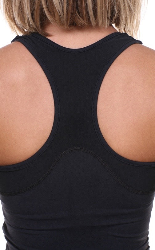 The rouched sides and scalloped hem on this Vimmia racerback tank are super flattering. Double layer mesh on the racerback adds another element of fabulous. Lined shelf bra with removable pads. A great basic tank for all your workout needs with a feminine twist.