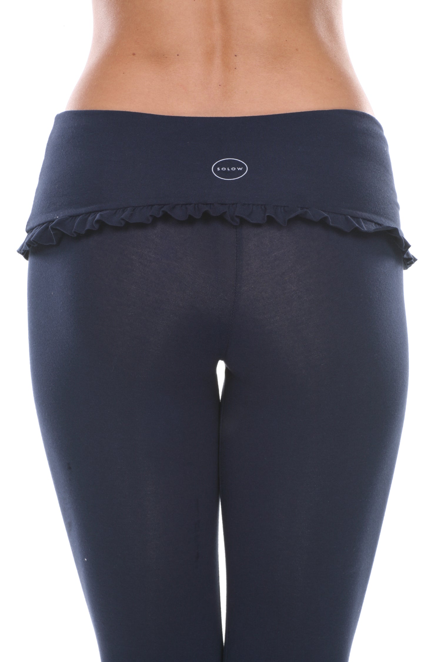 Sweet ruffles make this classic foldover cotton jersey legging by Solow a ladylike and fun addition to your workout closet. This is a super soft jersey with very light compression. The waistband is 5” folded and those ruffles are so gosh darn adorable…we love them. Wear the waist high or low, that fold is up to you.