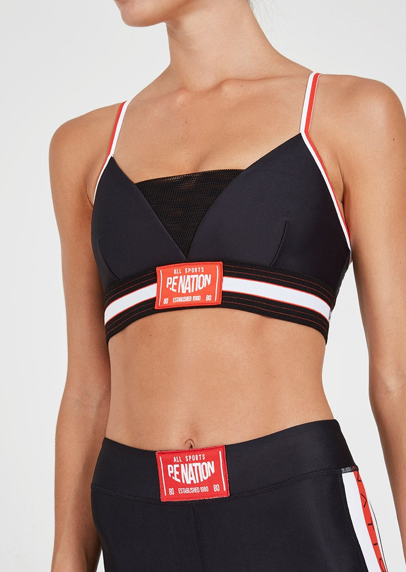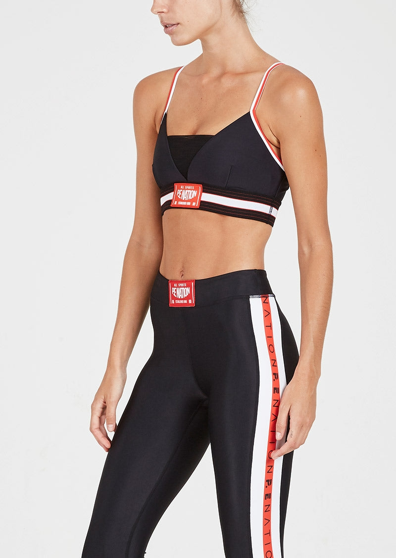 Complete your gym kit with the Left Hook Crop by PE Nation. This sexy, sporty bra-style crop offers compressive support and with adjustable straps for a custom fit and will provide support and comfort where you need it most. The Left Hook was made for the boxing ring, but looks just as good in your next pilates or barre class. Pair it with the Brawler Legging for a high-impact set. Fully lined, adjustable straps, sexy mesh v-insert, striped jaquard underbust elastic.
