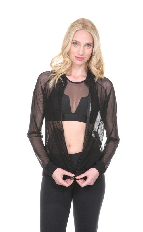 Espalier mesh jacket will give you light coverage while looking super chic. See thru mesh throughout with zip front and pockets. Banding at sleeves and bottom. Equally fabulous for workout or all day. Show off your favorite sports bra while staying covered.