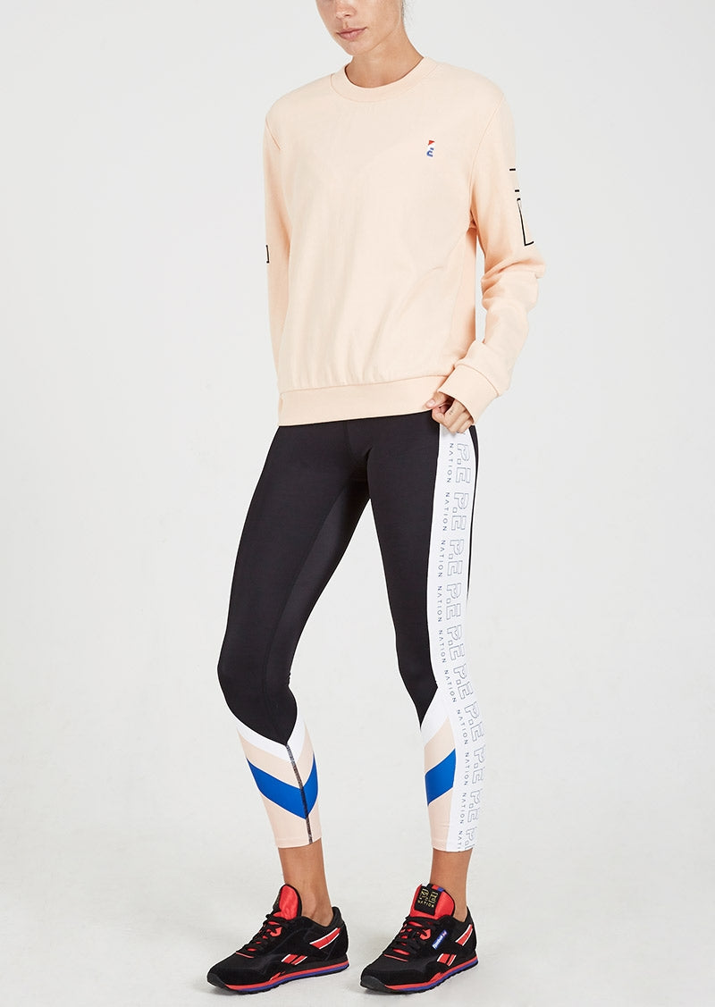 If you're after an everyday staple sweat, meet the Moneyball by PE Nation. Offering a flattering yet relaxed fit with a subtle drop-shoulder, the Moneyball Sweat is an elevated take on a classic pullover. The slightly cropped finish makes it perfect teamed with high-rise leggings. Graphic print on arms with ribbed cuffs, neckline, and hemline. 100% cotton loop back french terry. Embroidered PE logo on chest.