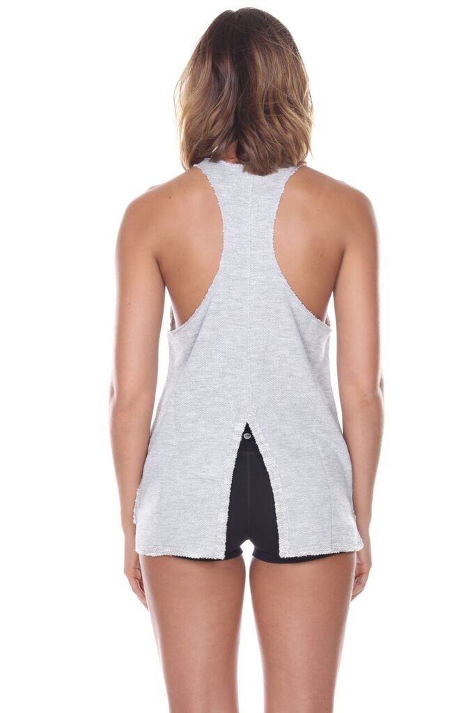 Perfectly loose and slouchy relaxed racerback tank by Vimmia in a soft sweatshirt construction with a nubby terry interior. Raw edges and a raw seam down the front and back keep it hip. Longer in the back with a cutout slit and deep armholes complete the look.