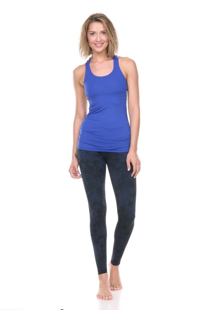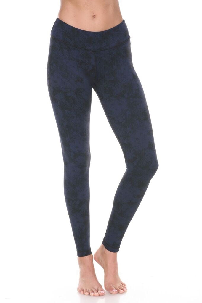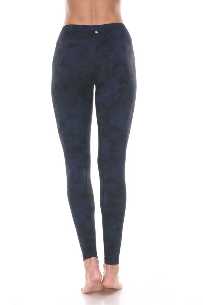 Vimmia signature mid-rise legging goes up a notch in this mottled navy/black print. Wear it one way the blue is more prominent, reverse it and the black is more prominent. Soft feel with the ultimate high performance compression. Wide reinforced waistband stays smooth and secure. Pair with the Harmony Tank or Bolt Bra in royal to highlight the stylish blue.