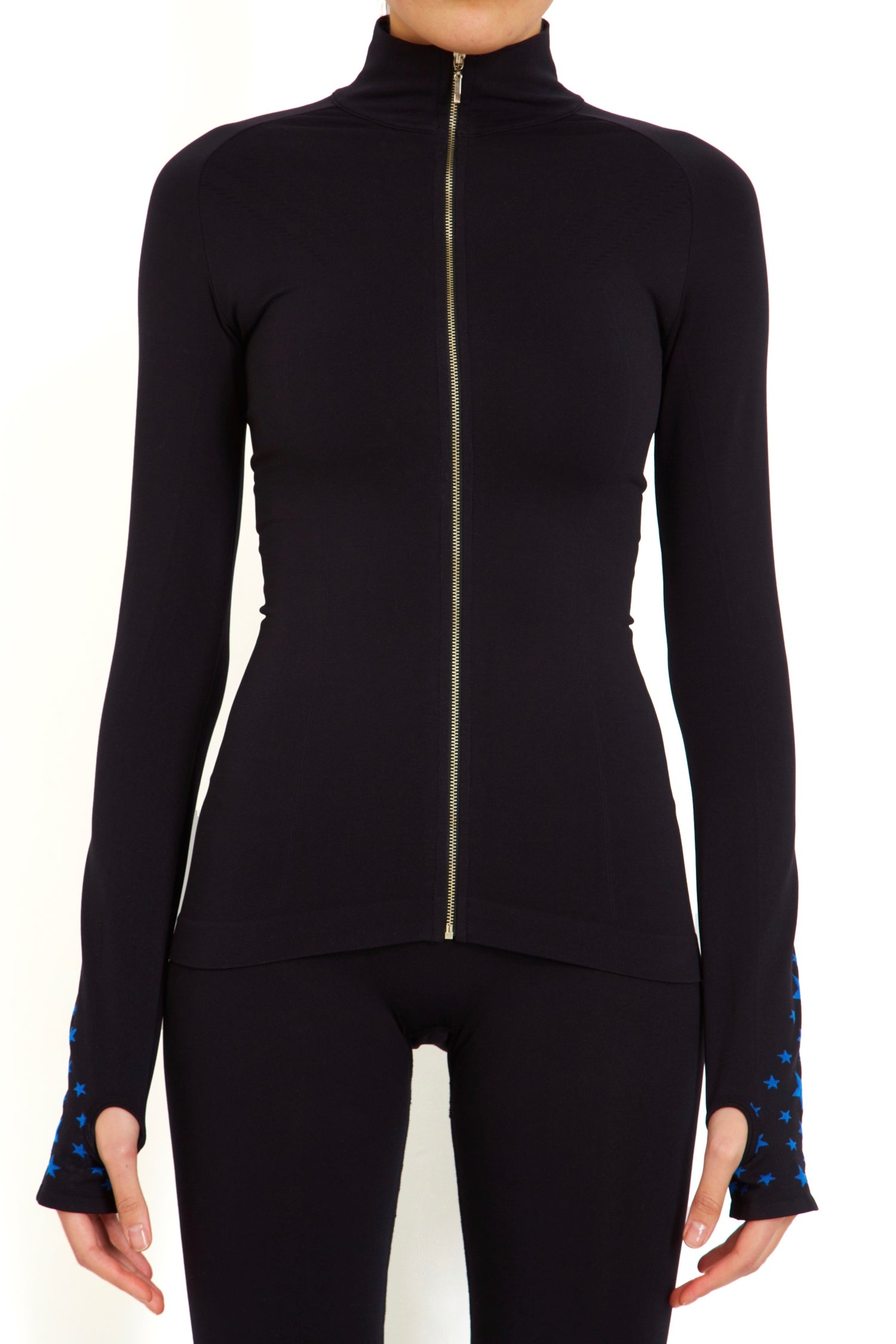 The Seamless Star Jacket by BoomBoom Athletica is a warm up/down jacket featuring seamless construction, full length zip, handwarmer cuffs and blue stars on the wrists. Navy stripes inside collar. Form fitting. Soft fabrication with gret stretch. Love stars? So do we!