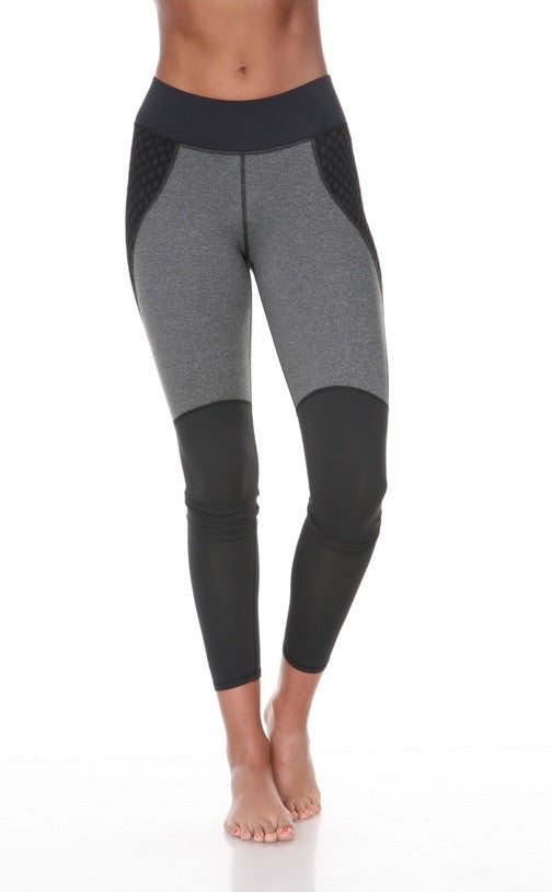High performance full length Michi leggings with thigh high piecing and angular fishnet inserts that create a slimming effect and a lengthening thigh high look. These leggings are bold and fabulous. Curved seaming on the backside for your best butt. Silky soft, moisture wicking, breathable fabric for comfort and ease of movement. Make a statement...
