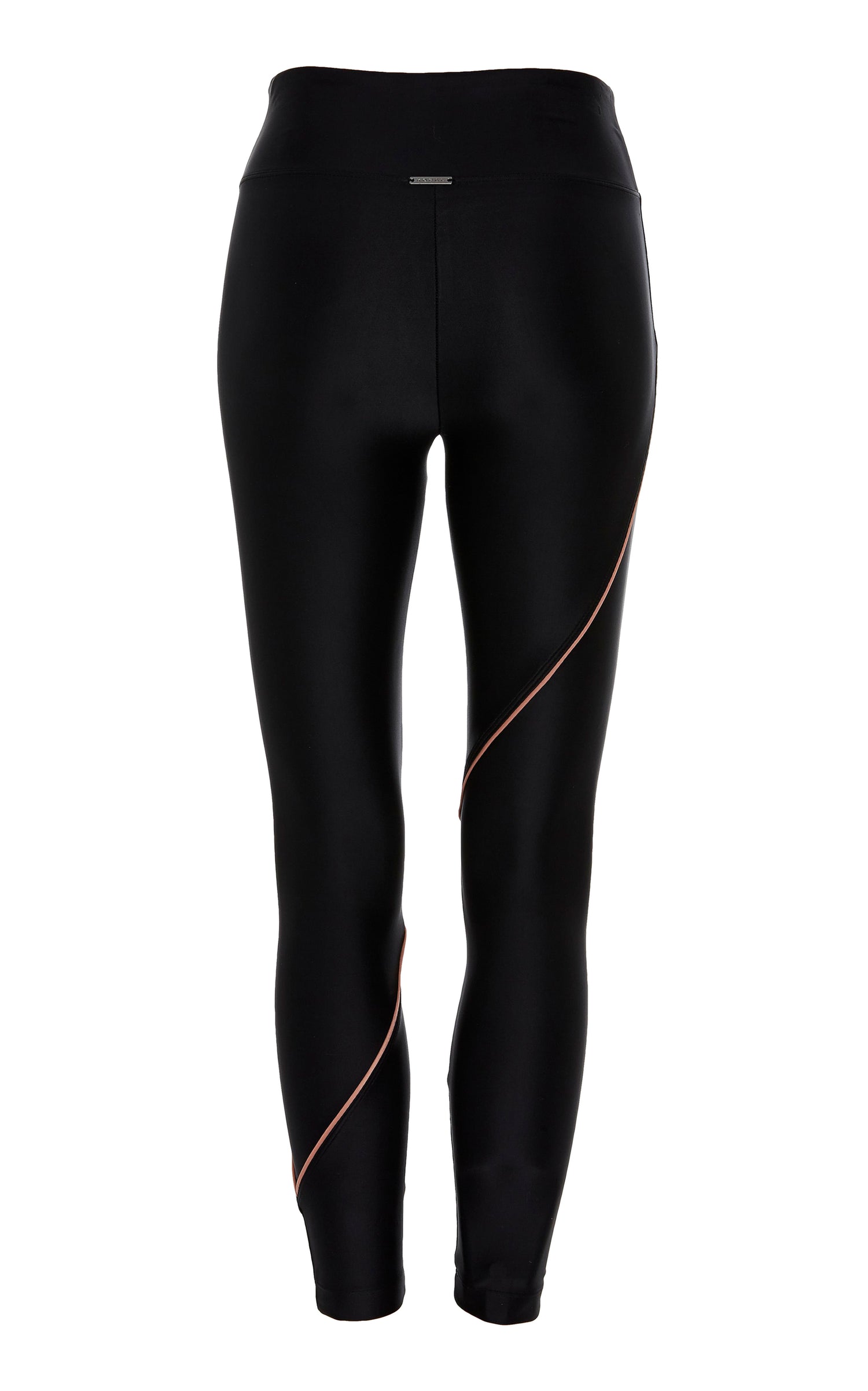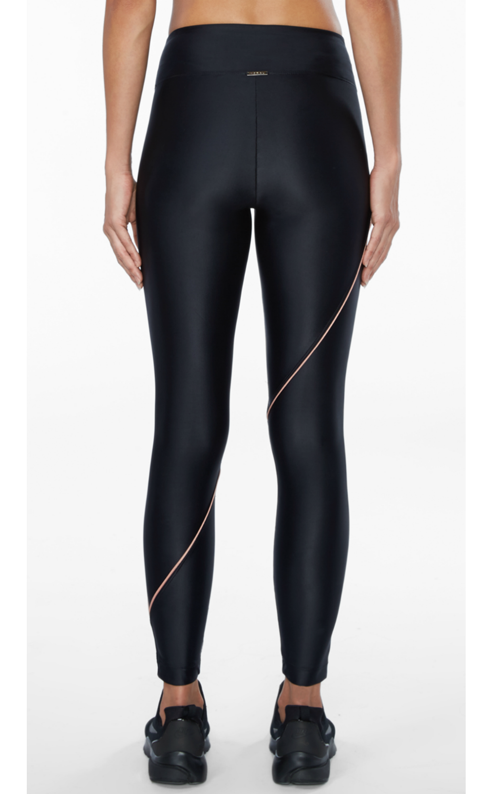 The Street Legging by Koral with contrast piping detail in the color of the season, a peachy blush, kicks up your basic black in the most wonderful way. Mid-rise, ankle length legging constructed in a second-skin slick to the touch fabrication with excellent compression and stretch. This fabric smooths over everything giving you a flawless look. Pair with the coordinating (and stunning) Valley Bra...unforgettable!
