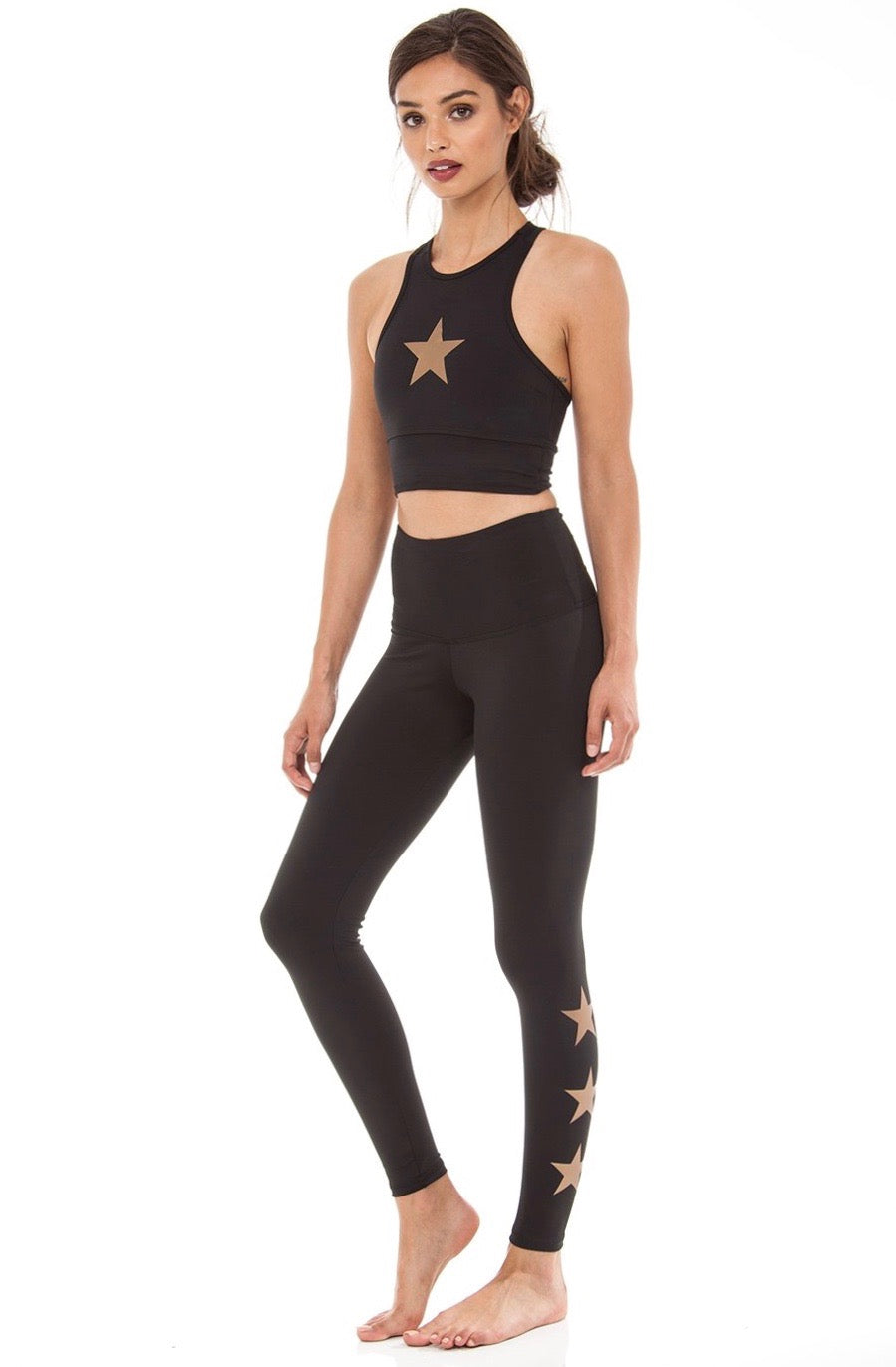 The Teagan ultra high-waisted Star Legging with metallic copper stars by Strut-This fits like a glove with fabulous stretch and compression. Wide 5" lined waistband is both on-trend and provides smooth support. Strut-This has amazing stretch and is one size fits most (hard to believe, but true). Now you can look like the star you are.