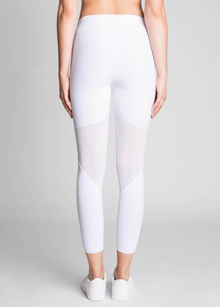 No show white leggings...could it be true? Bend and stretch with style & confidence in these white hot Tracking Leggings by Heroine Sport. Light grey inner lining offers the ultimate level of coverage and smoothing. White mesh panels keep you looking cool while looking hot. Mid-rise waist with reinforced gusset. 2" elastic waistband for comfort and smoothness. 4-way stretch, moisture wicking, breathable, high performance fabric.