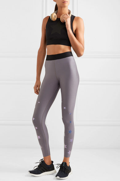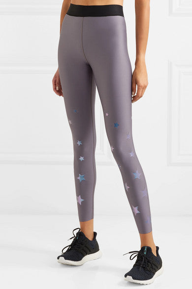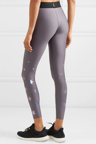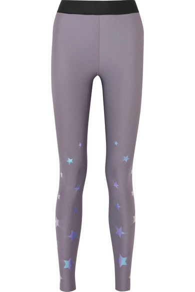 High Luster Holograph Legging by Ultracor in the most gorgeous lavender is a true show stopper. Statement leggings that mix performance, comfort and style detailed with cascading holographic stars down the leg. Made of high-tech, high stretch, second skin, silky-soft compression fabric with built-in shapeware to provide an instant butt lift. No front seam for a clean flattering fit. High-rise fit with a supportive 3" solid ultra high elastic waistband. Ankle length.