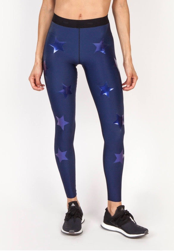 The hottest leggings on the market right now...the bestselling Knockout Leggings by Ultracor are a definite knockout with bonded navy patent star detail. Made of high-tech, high stretch, second skin, silk-like compression fabric with built-in shapeware to provide an instant butt lift. No front seam for a clean flattering fit. High rise fit with a supportive ultra high 3" waistband. Ankle Length. go ahead...be a star!