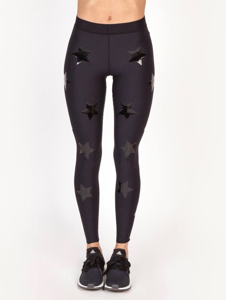 The hottest leggings on the market right now...the bestselling Lux Knockout Leggings by Ultracor are a definite knockout with bonded black patent star detail. Made of high-tech, high stretch, second skin, silky-soft compression fabric with built-in shapeware to provide an instant butt lift. No front seam for a clean flattering fit. High-rise fit with a supportive 2" waistband. Ankle Length. go ahead...be a star!