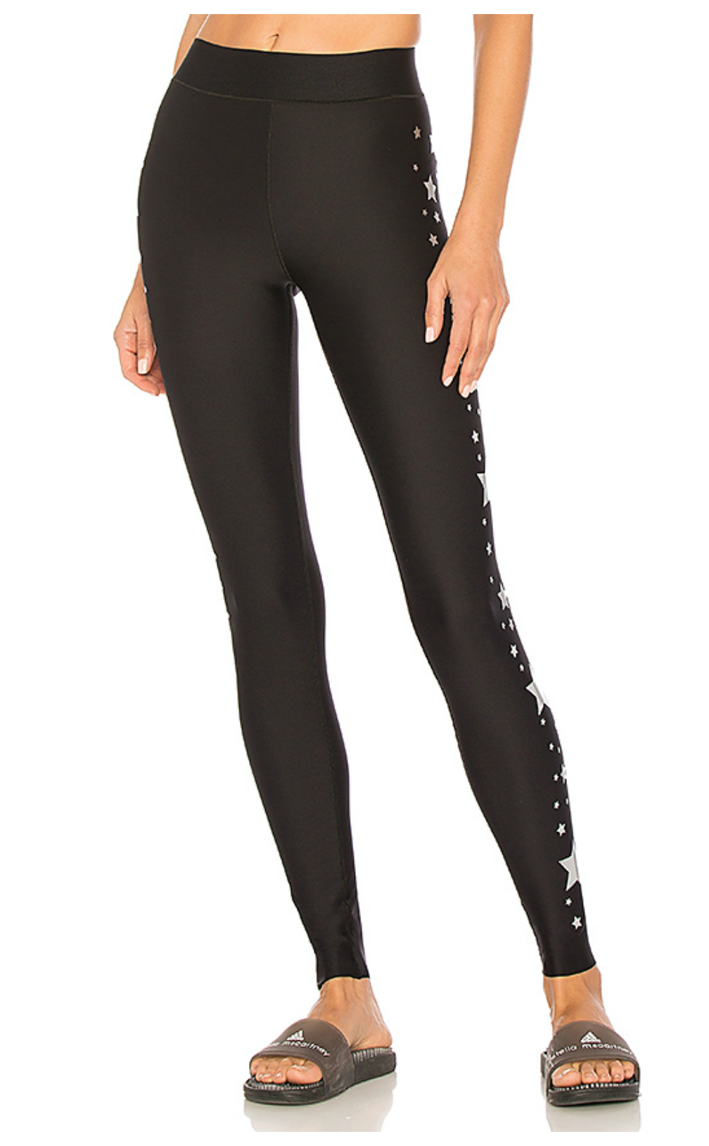 A fresh take on the bestselling Ultracor Knockout star leggings...the new Steller print features a splattering of metallic stars down the leg. A perfect cross between silver and gold (sometimes it looks silver...sometimes it looks gold) provides chic versatility. Made of high-tech, high stretch, second skin, silky-soft compression fabric with built-in shapeware to provide an instant butt lift. No front seam for a clean flattering fit. High-rise fit with a supportive 2" solid elastic waistband. Ankle length.